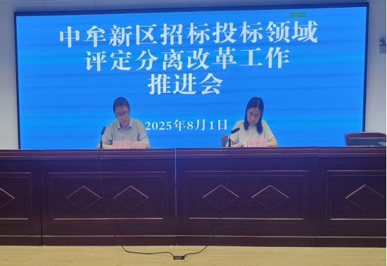 中牟新区发改委招投标领域“评定分离”改革 工作推进会 全力推动改革落地见效 为深入贯彻国家、省、市招标投标领域改革部署,统一思想、明确责任、规范流程,确保政府投资工程建设项目“评定分离”工作落地见效,8月1日,中牟新区发改委组织召开招投标领域“评定分离”改革工作推进会。会议由新区发改委公共资源交易中心主任吕会强主持,教育局等28个相关单位、14个乡镇街道、4个园区、5个平台公司及31家代理机构负责人参会。 会上,交易中心副主任马维娟对省、市“评定分离”改革政策进行深入解读,重点阐释了改革的目的、意义、定标原则及纪律规定,为各单位准确把握政策方向提供了清晰指引。 随后,中心业务科科长邢天赐围绕“评定分离”交易模式,对政府投资工程建设项目中招标人主体责任、定标方法选择等全流程关键环节进行详细解析,为各单位规范开展招投标工作提供了具体实操指导。 最后结合会议内容与工作实际,吕会强主任提出三点要求:一是提高政治站位,严守改革纪律。要求各招标人、监管部门和代理机构要深刻认识“评定分离”改革的重要性,将其作为落实全面从严治党要求、净化招投标市场生态的关键抓手,确保改革稳步推进。二是强化监督制约,筑牢廉政防线。各单位需健全内控机制,加强评标定标全流程风险防控,尤其在定标委员会组建、中标候选人核查等关键环节,必须做到公开透明、规范有序,从源头上防范廉政风险。三是压实各方责任,凝聚工作合力。招标人要切实履行主体责任,行政监督部门强化行业监管,公共资源交易中心做好服务保障,形成齐抓共管格局;以改革为契机全面规范招投标行为,提升公共资源配置效率。